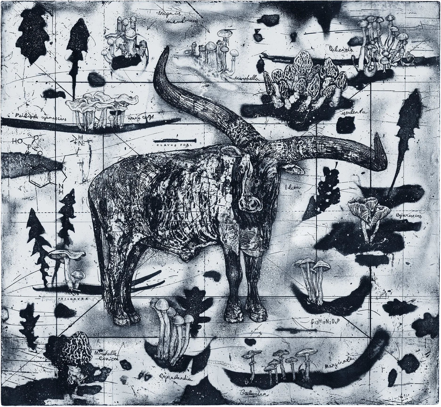 Beyond the majestic bovine, the print delves into the intricate ecosystem of the land. It functions as a botanical study, meticulously depicting various mushrooms that grow from the Watusi's droppings, all of which are species found in and around Northern California. Crucially, many of these depicted mushrooms contain psilocybin, further reinforcing the ethereal and "otherworldly" impression of Teravana and its resident Watusi. This detail highlights the cyclical nature of life and the unexpected, profound connections within the environment, hinting at layers of perception beyond the ordinary. This grounding in specific local flora, particularly those with mind-altering properties, adds a layer of mystical realism to the piece.